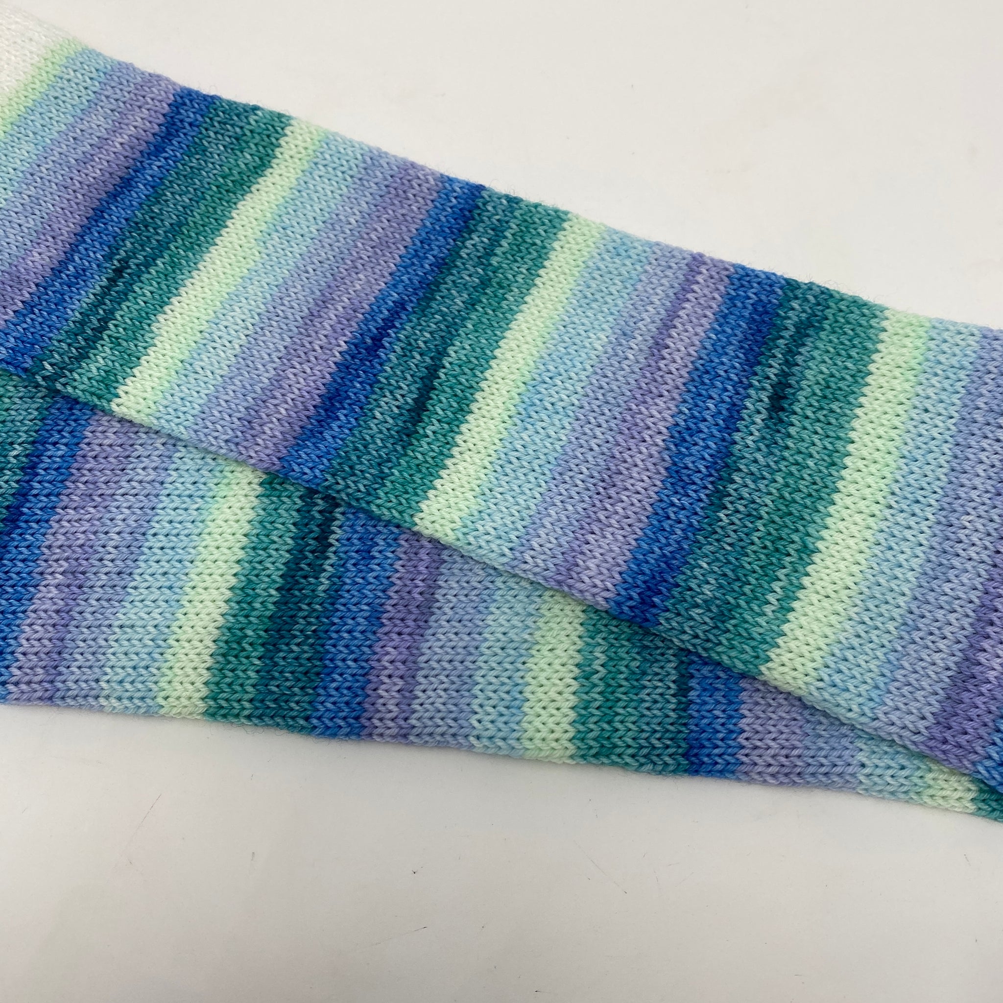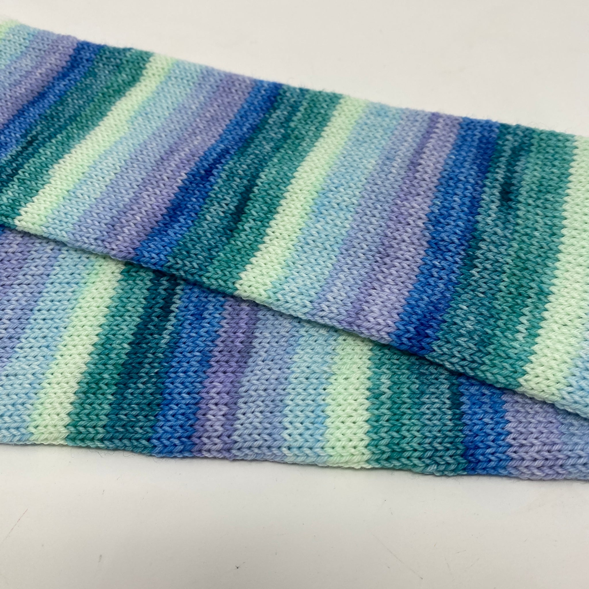 ###### As with any handpainted yarn, needle size, stitch count, gauge etc will affect how the colors "land" so yours may not be identical to my swatch, but that's the fun part. My small swatch was knit at 8 st/" over 64 stitches.
